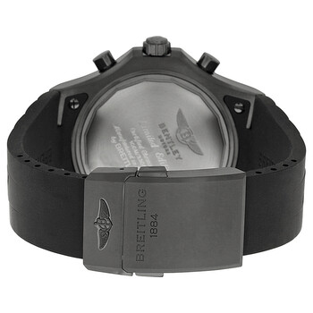 (Breitling) blacksteel case with a black rubber strap. Bi-directional rotating (breitling) blacksteel bezel. Ebony dial with luminous hands and index hour markers. An Arabic numeral marks the 12 o'clock position. 24 hour (GMT) markings. world time cities around the outer rim. Dial Type: Analog. Luminescent hands and markers. Date display at the 6 o'clock position. Chronograph - three sub-dials displaying: 60 second, 6 hour and 15 minutes. Automatic movement with a 42 hour power reserve. Scratch resistant sapphire crystal. Screw down crown. Solid case back. Case diameter: 49 mm. Case thickness: 16.4 mm. Round case shape. Deployment clasp. Water resistant at 100 meters / 330 feet. Functions: chronograph, date, hour, minute, second. Luxury watch style. Watch label: Swiss Made. Breitling Bentley GMT Ebony Dial Automatic Watch M4736225-BC76BKRD.