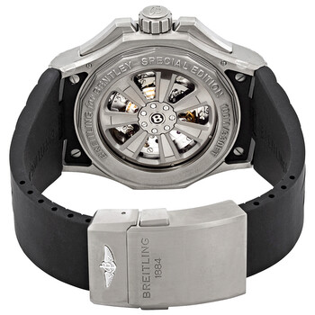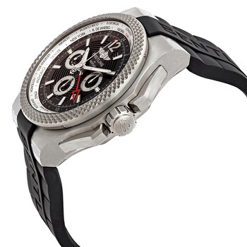Titanium case with a black rubber strap. Bi-directional rotating titanium bezel. Tungsten grey dial with luminous silver-tone hands and index hour markers. An Arabic numeral appears at the 12 o'clock position. Minute markers. 24 hour markers. World time cities around the inner bezel. Dial Type: Analog. Luminescent hands and markers. Date display between the 4 and 5 o'clock positions. Chronograph - three sub-dials displaying: 60 second, 30 minute and 12 hours. Breitling calibre 04 automatic movement with a 70-hour power reserve. Scratch resistant sapphire crystal. Screw locked crown. Transparent case back. Round case shape. Case size: 49 mm. Case thickness: 16 mm. Band width: 29 mm. Band length: 8 inches. Deployment clasp. Water resistant at 100 meters / 330 feet. Functions: GMT, second time zone, hour, minute, second, date, chronograph. Luxury watch style. Watch label: Swiss Made. Breitling Bentley GMT Light Body B04 Chronograph Automatic Men's Watch EB043210/M533-222S-E20DSA.2.