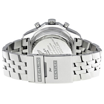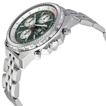 Silver-tone stainless steel case with a silver-tone stainless steel bracelet. Uni-directional rotating silver-tone stainless steel bezel. Green dial with silver-tone hands and stick hour markers. Minute markers around the outer rim with tachymeter scale. Dial Type: Analog. Luminescent hands and markers. Day of the week and date display at the 3 o'clock position. Chronograph - three sub-dials displaying: 60 second, 30 minute and 12 hour. Breitling Calibre 13B Automatic movement, based upon ETA Valjoux 7750, containing 25 Jewels, bitting at 28800 vph, and has a power reserve of approximately 42 hours. Scratch resistant sapphire crystal. Screw down crown. Solid case back. Round case shape, case size: 44.8 mm, case thickness: 15 mm. Band width: 22 mm, band length: 8.5 inches. Fold over with safety release clasp. Water resistant at 100 meters / 330 feet. Functions: chronograph, date, day, hour, minute, second. Additional Info: chronograph; day and date display at 3 o'clock position. Breitling For Bentley Series. Luxury watch style. Watch label: Certifie Chronometre. Item Variations: A1336212. Breitling Bentley GT Automatic Chronograph Men's Watch A1336212-L503SS.