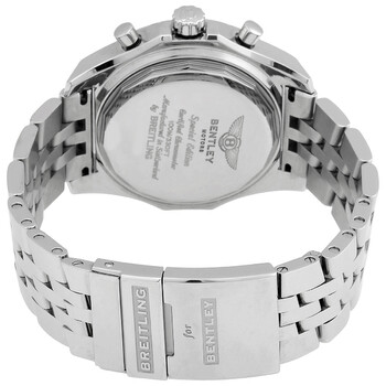 Silver-tone polished steel case with a silver-tone polished steel bracelet. Bi-directional rotating slide rule silver-tone stainless steel bezel. Burgundy dial with luminous hands and luminous hour markers. Slide rule markers around the outer rim. Dial Type: Analog. Luminescent hands and dial markers. Day of the week and date display at the 3 o'clock position. Chronograph - three sub-dials displaying: 60 second, 60 minute and 12 hour. Breitling Calibre 13B Automatic movement, based upon ETA Valjoux 7750, containing 25 Jewels, bitting at 28800 vph, and has a power reserve of approximately 42 hours. Scratch resistant sapphire crystal. Screw locked crown. Round case shape, case size: 44.8 mm, case thickness: 15 mm. Band width: 22 mm, band length: 8.5 inches. Deployment clasp. Water resistant at 100 meters / 330 feet. Functions: chronograph, date, day, hour, minute, second, tachymeter. Additional Info: chronograph; day and date display at 3 o'clock position. Breitling For Bentley Series. Sport watch style. Watch label: Certifie Chronometre. Item Variations: A1336212. Breitling Bentley GT Chronograph Steel Burgundy Men's Watch A1336212-K506SS.