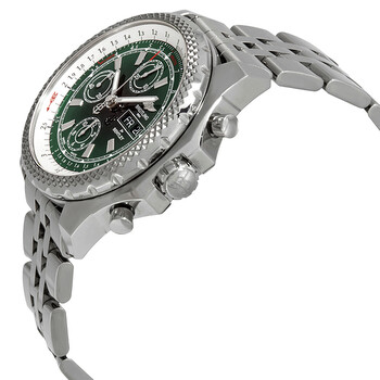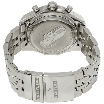Stainless steel case with a silver-tone stainless steel bracelet. Bi-directional rotating stainless steel bezel. Black dial with luminous silver-tone hands and index hour markers. Minute markers around the outer rim. Dial Type: Analog. Luminescent hands and markers. Day of the week and date display at the 3 o'clock position. Chronograph - three sub-dials displaying: 12 hour, 30 minute and 1/4th of a second. Breitling calibre 13B automatic movement with a 42-hour power reserve. Scratch resistant sapphire crystal. Screw down crown. Solid case back. Round case shape. Case size: 45 mm. Case thickness: 15 mm. Band width: 22 mm. Deployment clasp. Water resistant at 100 meters / 330 feet. Additional Information: Slide Rule" aka "Navigation Computer" which allows to compute different airborne calculations such as fuel consumption, climbing times & converting miles into nautical miles or kilometers. Functions: chronograph, date, day, hour, minute, second, slide rule (aka navigation computer). Luxury watch style. Watch label: Swiss Made. Breitling Bentley GT II Automatic Black Dial Men's Watch A1336512/L520.