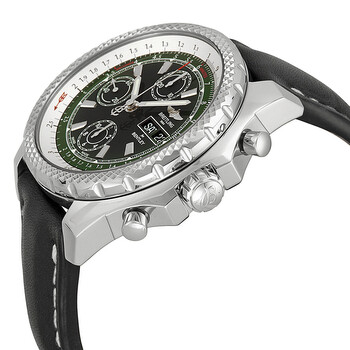 Silver-tone stainless steel case with a black calfskin leather strap. Bi-directional rotating slide rule silver-tone stainless steel bezel. Black and green dial with luminous hands and index hour markers. Minute markers. navigation computer markings around the outer rim. Dial Type: Analog. Luminescent hands and markers. Day of the week and date display at the 3 o'clock position. Chronograph - three sub-dials displaying: 60 second, 30 minute and 12 hour. Breitling Calibre 13B Automatic movement, based upon ETA Valjoux 7750, containing 25 Jewels, bitting at 28800 vph, and has a power reserve of approximately 42 hours. Scratch resistant sapphire crystal. Screw locked crown. Solid case back. Round case shape, case size: 45 mm, case thickness: 15 mm. Band width: 22 mm. Tang clasp. Water resistant at 100 meters / 330 feet. Functions: chronograph, date, day, hour, minute, second. Bentley Gt II Series. Luxury watch style. Watch label: Swiss Made. Breitling Bentley GT II Green Dial Black Leather Men's Watch A1336512-L520BKLT.