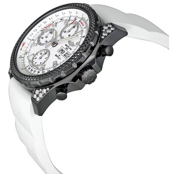 Black PVD stainless steel case with a white rubber strap. Bi-directional rotating slide rule black stainless steel bezel. White dial with silver-tone hands and stick hour markers. Minute markers around the outer rim. Dial Type: Analog. Luminescent hands and markers. Day of the week and date display at the 3 o'clock position. Chronograph - three sub-dials displaying: 60 second, 30 minute and 12 hour. Breitling Calibre 13B Automatic movement, based upon ETA Valjoux 7750, containing 25 Jewels, bitting at 28800 vph, and has a power reserve of approximately 42 hours. Scratch resistant sapphire crystal. Screw down crown. Solid case back. Round case shape, case size: 45 mm, case thickness: 16 mm. Band width: 22 mm. Fold over clasp. Water resistant at 100 meters / 330 feet. Functions: chronograph, date, day, hour, minute, second. Breitling For Bentley Series. Luxury watch style. Watch label: Swiss Made. Breitling Bentley GT Midnight Diamond Watch M1336267-A729WTRD.