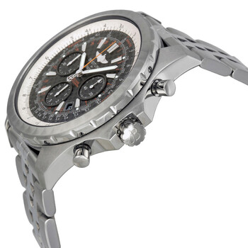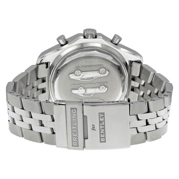 Stainless steel case with a stainless steel bracelet. Bi-direction rotating stainless steel bezel with circular slide rule. Black carbon dial with luminous silver-tone hands and index hour markers. Minute markers around the outer rim. Dial Type: Analog. Luminescent hands and markers. Date display between the 4 and 5 o'clock positions. Chronograph - three sub-dials displaying: 60 second, 15 minute and 6 hour. Automatic movement with a 42-hour power reserve. Scratch resistant sapphire crystal. Screw locked crown. Solid case back. Case diameter: 49 mm. Case thickness: 14.8 mm. Round case shape. Band width: 22.9 mm. Band length: 9 inches. Hidden fold over clasp. Water resistant at 100 meters / 330 feet. Functions: chronograph, date, hour, minute, second. Luxury watch style. Watch label: Swiss Made. Breitling Bentley Motors T Black Dial Stainless Steel Men's Watch A253652D-BC59SS.