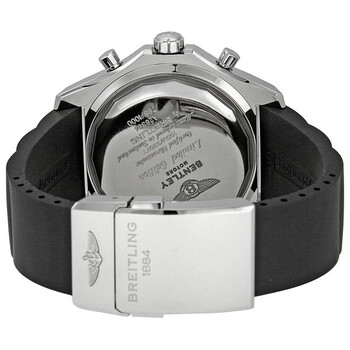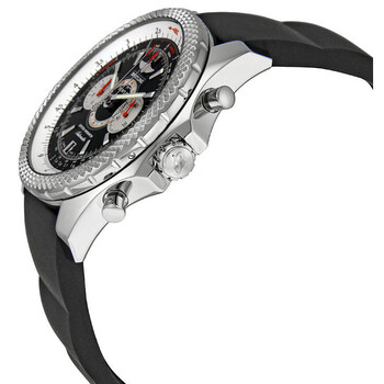 Stainless steel case with a black rubber strap. Rotating pinion bezel. Black dial with luminous hands and index hour markers. Variable tachometer appears around the outer rim. Date display appears at the 6 o'clock position. Two: 12 hours, and 60 seconds sub-dials. Self-winding movement. Scratch resistant sapphire crystal. Screw locked crown. Case diameter: 48.70 mm. Deployment clasp. Water resistant at 100 meters/ 330 feet. Functions: hours, minutes, seconds, calendar, chronograph, tachymeter. Breitling Bentley SuperSport Royal Ebony Men's Watch A2636412-BA22BKPD.