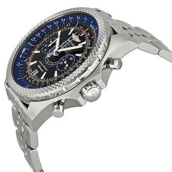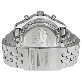 Stainless steel case with a stainless steel bracelet. Bi-directional rotating stainless steel bezel. Royal ebony dial with silver-tone hands and stick hour markers. Minute markers around the outer rim. Dial Type: Analog. Luminescent hands and markers. Date display at the 6 o'clock position. Chronograph - three sub-dials displaying: 12 hour, 60 minute and 1/4th of a second. Automatic movement with 42 hour power reserve. Scratch resistant sapphire crystal. Screw down crown. Solid case back. Case diameter: 49 mm. Round case shape. Fold over clasp with safety. Water resistant at 100 meters / 330 feet. Functions: chronograph, date, hour, minute, second. Luxury watch style. Watch label: Swiss Made. Breitling Bentley Supersports Automatic Chronograph Men's Watch A2636416-BB66SS.
