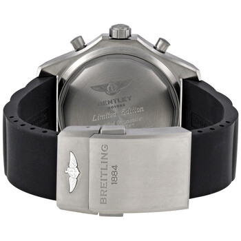 Stainless steel case with a black rubber strap. Bidirectional stainless steel bezel. Black and green dial with silver-tone hands and stick hour markers. Minute markers. Navigation computer markings around the outer rim. Dial Type: Analog. Luminescent hands and markers. Date display appears at the 6 o'clock position. Chronograph - three sub-dials displaying: 60 second, 60 minute and 12 hour. Automatic movement. Scratch resistant sapphire crystal. Screw down crown. Solid case back. Case diameter: 48.7 mm. Case thickness: 17 mm. Round case shape. Band width: 24 mm. Fold over clasp with safety release. Water resistant at 100 meters / 330 feet. Functions: chronograph, date, hour, minute, second. Additional Info: variable tachometer. "Navigation Computer" which allows to compute different airborne calculations such as fuel consumption, climbing times and converting miles into nautical miles or kilometers.. Luxury watch style. Watch label: Swiss Made. Breitling Bentley Supersports Automatic Men's Watch E2736536-BB37BKRD.