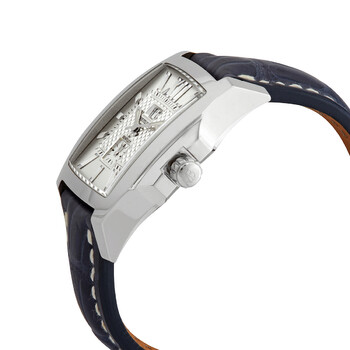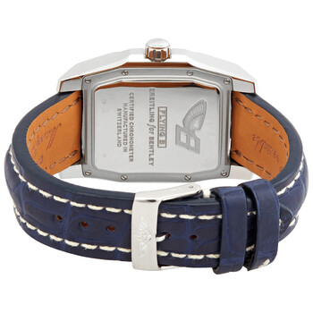 Silver-tone stainless steel case with a blue leather strap. Fixed silver-tone stainless steel bezel. Silver dial with silver-tone hands and index hour markers. Roman numeral marker at the 12 o'clock position. Minute markers around the inner ring. Dial Type: Analog. Date display below the 12 o'clock position. One subdial displaying: small second. Breitling Calibre 16 Automatic movement, based upon ETA 2892-A2, containing 30 Jewels, bitting at 28800 vph, and has a power reserve of approximately 42 hours. Scratch resistant sapphire crystal. Pull / push crown. Solid case back. Rectangle case shape, case size: 34.5 mm. Tang clasp. Water resistant at 100 meters / 330 feet. Functions: big date, hour, minute, small second. Breitling For Bentley Series. Luxury watch style. Watch label: Swiss Made. Breitling Breitling for Bentley Automatic Silver Dial Watch J1636212/G638.889P.J18.
