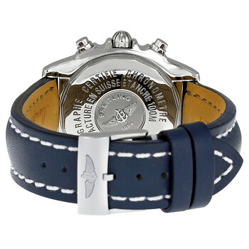 Stainless steel case with a blue leather strap. Uni-directional rotating stainless steel bezel. Blue dial with silver-tone hands and stick hour markers. Minute markers. Tachymeter around the outer rim. Dial Type: Analog. Luminescent hands and markers. Date display appears at the 3 o'clock position. Chronograph - three sub-dials displaying: 60 second, 30 minute and 12 hour. Automatic movement. Scratch resistant sapphire crystal. Screw down crown. Solid case back. Case diameter: 39 mm. Case thickness: 14.8 mm. Round case shape. Band width: 20 mm. Tang clasp. Water resistant at 100 meters / 330 feet. Functions: chronograph, date, hour, minute, second. Luxury watch style. Watch label: Swiss Made. Breitling Chrono Galactic Automatic Men's Watch A13358L2-C776BLLT.
