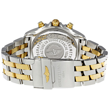 Two-tone (silver-tone and gold-tone) stainless steel case with a two-tone (silver-tone and gold-tone) stainless steel bracelet. Uni-directional rotating two-tone (silver-tone and gold-tone) bezel with diamond set. Mother of pearl dial with luminous hands and Roman numeral hour markers. Minute markers. tachymeter scale appears around the outer rim. Dial Type: Analog. Luminescent hands and markers. Date display at the 3 o'clock position. Chronograph - three sub-dials displaying: 60 second, 30 minute and 12 hour. Breitling Calibre 13 Automatic movement, based upon ETA Valjoux 7750, containing 25 Jewels, bitting at 28800 vph, and has a power reserve of approximately 42 hours. Scratch resistant sapphire crystal. Screw locked crown. Solid case back. Round case shape, case size: 39 mm, case thickness: 14.8 mm. Band width: 20-18 mm. Deployment clasp. Water resistant at 100 meters / 330 feet. Functions: chronograph, chronometer, date, hour, minute, second, tachymeter. Chrono Galactic Series. Sport watch style. Watch label: Swiss Made. Breitling Chrono Galactic Mother of Pearl Dial Diamond Bezel Two Tone Men's Watch.