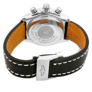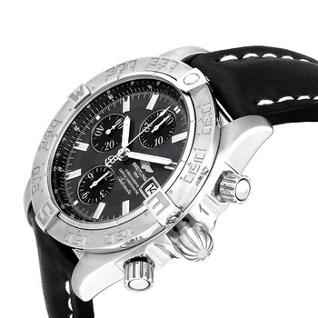 Silver-tone stainless steel case with a black leather strap. Bi-directional rotating bezel. Grey dial with silver-tone hands and index hour markers. Minute markers around the outer rim. Dial Type: Analog. Luminescent hands and markers. Date display at the 3 o'clock position. Chronograph - three sub-dials displaying: 60 second, 30 minute and 12 hours. Breitling Calibre 13 Automatic movement, based upon ETA Valjoux 7750, containing 25 Jewels, bitting at 28800 vph, and has a power reserve of approximately 42 hours. Scratch resistant sapphire crystal. Screw down crown. Round case shape, case size: 44 mm. Deployment clasp. Water resistant at 300 meters / 1000 feet. Functions: chronograph, date, hour, minute, second. Luxury watch style. Watch label: Swiss Made. Breitling Chronograph Automatic Grey Dial Men's Watch A1336410/F517.436X.A20DSA.1.
