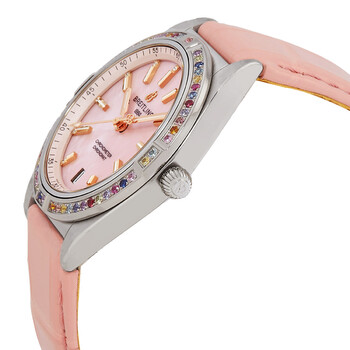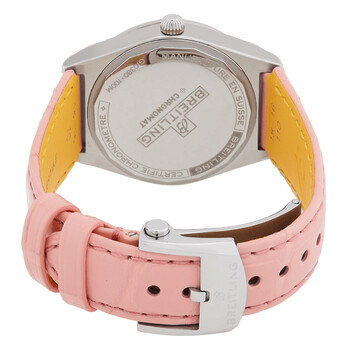 Stainless steel case with a pink leather (alligator) strap. Uni-directional rotating 18kt grey gold set with diamonds bezel. Mother of pearl dial with diamond-tipped index hour markers. Arabic numeral minute markers (at 5 minute intervals). Minute markers around the outer rim. Dial Type: Analog. Luminescent hands and markers. Date display at the 6 o'clock position. Breitling Calibre 10 Automatic movement, based upon ETA 2892-A2, containing 21 Jewels, bitting at 28800 vph, and has a power reserve of approximately 42 hours. Scratch resistant sapphire crystal. Screw down crown. Solid case back. Round case shape, case size: 36 mm, case thickness: 10 mm. Band width: 18 mm. Fold over clasp with a safety release. Water resistant at 100 meters / 330 feet. Functions: date, hour, minute, second. Chronomat Series. Luxury watch style. Watch label: Swiss Made. Breitling Chronomat 36mm South Sea Automatic Pink MOP Diamond Ladies Watch G10380BB1K1P1.