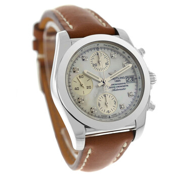 Silver-tone stainless steel case with a brown leather strap. Fixed silver-tone stainless steel bezel. Mother of pearl dial with silver-tone hands and diamond hour markers. Minute markers around the outer rim. Dial Type: Analog. Date display at the 3 o'clock position. Chronograph - three sub-dials displaying: 60 second, 30 minute and 12 hour. Breitling Calibre 13 Automatic movement, based upon ETA Valjoux 7750, containing 25 Jewels, bitting at 28800 vph, and has a power reserve of approximately 42 hours. Scratch resistant sapphire crystal. Solid case back. Round case shape, case size: 38 mm. Water resistant at 100 meters / 330 feet. Functions: chronograph, date, hour, minute, second, chronometer. Chronomat 38 Series. Casual watch style. Watch label: Swiss Made. Breitling Chronomat 38 Chronograph Automatic Chronometer Diamond Unisex Watch W1331012/A776-425X.