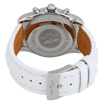 Stainless steel case with a white (Sahara) leather strap. Fixed stainless steel set with diamonds bezel. Mother of pearl dial with luminous silver-tone hands and diamond hour markers. Minute markers. Tachymeter marking around the outer rim. Dial Type: Analog. Luminescent hands. Date display at the 3 o'clock position. Chronograph - three sub-dials displaying: 60 second, 30 minute and 12 hours. Breitling calibre 13 automatic movement with a 42-hour power reserve. Scratch resistant sapphire crystal. Screw locked crown. Solid case back. Round case shape. Case size: 38 mm. Case thickness: 14.80 mm. Band width: 20 mm. Tang clasp. Water resistant at 100 meters / 330 feet. Functions: chronograph, tachymeter, date, hour, minute, second. Luxury watch style. Watch label: Swiss Made. Breitling Chronomat 38 Chronograph Automatic Diamond Ladies Watch A1331053-A776-237XS.