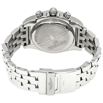 Silver-tone stainless steel case with a silver-tone stainless steel bracelet. Uni-directional rotating silver-tone stainless steel bezel. Black dial with silver-tone hands and index hour markers. Tachymeter. Dial Type: Analog. Luminescent hands and markers. Date display between 4 and 5 o'clock position. Chronograph - three sub-dials displaying: 60 second, 30 minute and 12 hour. Breitling Calibre 01 automatic movement with a 70-hour power reserve. Scratch resistant sapphire crystal. Screw down crown. Solid case back. Round case shape, case size: 41 mm, case thickness: 15.40 mm. Band width: 20 mm. Deployment clasp. Water resistant at 300 meters / 1000 feet. Functions: chronograph, date, hour, minute, second, chronometer. Luxury watch style. Watch label: Swiss Made. Breitling Chronomat 41 Airborne Chronograph Automatic Chronometer Black Dial Men's Watch AB01442J/BD26-378A.