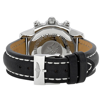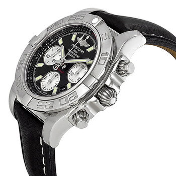 Stainless steel case with a black leather strap. Uni-directional rotating stainless steel bezel. Black dial with silver-tone hands and stick hour markers. Minute markers. Tachymeter around the outer rim. Dial Type: Analog. Luminescent hands and markers. Date display appears between the 4 and 5 o'clock positions. Chronograph - three sub-dials displaying: 60 second, 30 minute and 12 hour. Automatic movement with 70 hour power reserve. Scratch resistant sapphire crystal. Screw down crown. Solid case back. Case diameter: 41 mm. Case thickness: 15.4 mm. Round case shape. Band width: 20 mm. Tang clasp. Water resistant at 300 meters / 1000 feet. Functions: chronograph, date, hour, minute, second. Luxury watch style. Watch label: Swiss Made. Breitling Chronomat 41 Automatic Black Dial Men's Watch AB014012-BA52BKLT.
