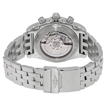 Silver-tone stainless steel case and bracelet. Uni-directional rotating silver-tone stainless steel bezel. Black dial with silver-tone hands and index hour markers. Tachymeter scale around the outer rim, minute markers around the outer rim. Dial Type: Analog. Luminescent hands and markers. Date display between 4 and 5 o'clock position. Chronograph - three sub-dials displaying: 12 hours, 30 minutes, 60 seconds. Breitling Calibre 01 Automatic movement, containing 47 Jewels, composed of 346 parts, bitting at 28800 vph, and has a power reserve of approximately 70 hours. Scratch resistant sapphire crystal. Screw down crown. Solid case back. Round case shape, case size: 41 mm, case thickness: 15.4 mm. Deployment with push button release clasp. Water resistant at 300 meters / 1000 feet. Functions: chronograph, date, hour, minute, second. Chronomat 41 Series. Luxury watch style. Watch label: Swiss Made. Breitling Chronomat 41 Chronograph Automatic Black Dial Men's Watch AB014113/BB47.381A.