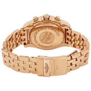 18kt rose gold case with a 18kt rose gold pilot bracelet. Uni-directional rotating 18kt rose gold bezel. Mother or pearl dial with luminous rose gold-tone hands and index hour markers. Minute markers. 1/100 minute markers. Tachymeter markings around the outer rim. Dial Type: Analog. Luminescent hands and markers. Date display between the 4 and 5 o'clock positions. Chronograph - three gold sub-dials displaying: 60 second, 30 minute and 12 hour. Breitling calibre 01 automatic movement with a 70-hour power reserve. Scratch resistant sapphire crystal. Screw locked crown. Solid case back. Round case shape. Case size: 41 mm. Case thickness: 15.40 mm. Band width: 20 mm. Deployment clasp. Water resistant at 300 meters / 1000 feet. Functions: chronograph, chronometer, date, hour, minute, second. Luxury watch style. Watch label: Swiss Made. Item Variations: HB014012 A722, HB014012.A722, HB014012A722. Breitling Chronomat 41 Chronograph Automatic Chronometer Men's Watch HB014012-A722.