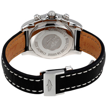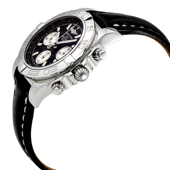 Stainless steel case with a black leather strap. Uni-directional rotating stainless steel bezel. Black dial with luminous silver-tone hands and index hour markers. Minute markers. 1/100th markers. tachymeter markings around the outer rim. Dial Type: Analog. Luminescent hands and markers. Date display between the 4 and 5 o'clock positions. Chronograph - three sub-dials displaying: 60 second, 30 minute and 12 hour. Breitling Calibre 01 automatic movement with about 70 hours of power reserve. Scratch resistant sapphire crystal. Screw down crown. Solid case back. Case size: 41 mm. Case thickness: 15.40 mm. Round case shape. Band width: 20 mm / 18 mm. Deployment clasp. Water resistant at 300 meters / 1000 feet. Functions: chronograph, chronometer, date, hour, minute, second, tachymeter. Luxury watch style. Watch label: Swiss Made. Breitling Chronomat 41 Chronograph Men's Watch AB014012/BA52BKLD.