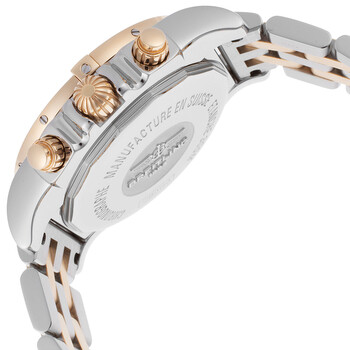 Stainless steel case with a stainless steel bracelet with 18kt rose gold links. Uni-directional rotating 18kt rose gold bezel. Mother of pearl dial with luminous rose gold-tone hands and diamond hour markers. Minute markers. 1/100th second markers. Tachymeter markings around the outer rim. Dial Type: Analog. Luminescent hands and markers. Date display between the 4 and 5 o'clock positions. Chronograph - three sub-dials displaying: 60 second, 30 minute and 12 hour. Breitling calibre 01 automatic movement with a 70-hour power reserve. Scratch resistant sapphire crystal. Screw locked crown. Solid case back. Round case shape. Case size: 41 mm. Case thickness: 15.40 mm. Band width: 20 mm. Fold over clasp with a push button release. Water resistant at 300 meters / 1000 feet. Functions: chronograph, chronometer, date, hour, minute, second. Luxury watch style. Watch label: Swiss Made. Breitling Chronomat 41 Mother of Pearl Diamond Dial Men's Watch CB014012-A723TT.
