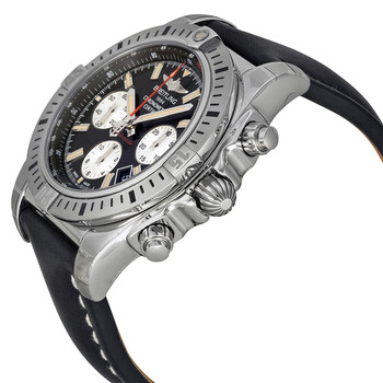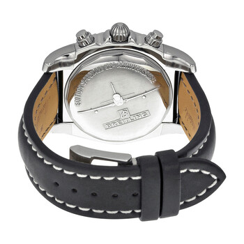 Stainless steel case with a black leather strap. Uni-directional rotating stainless steel bezel. Black dial with silver-tone hands and index hour markers. Minute markers around the outer rim. Dial Type: Analog. Date display between 4 and 5 o'clock position. Chronograph - three sub-dials displaying: 1/4 second, 30 minute, 12 hour. Automatic movement. Breitling 01 engine. Scratch resistant sapphire crystal. Screw down crown. Engraved with anniversary inscription- outline of aermacchi aircraft flown by frecce tricolori case back. Case diameter: 44 mm. Round case shape. Tang clasp. Water resistant at 500 meters / 1650 feet. Functions: chronograph, date, hour, minute, second, chronometer. Luxury watch style. Watch label: Swiss Made. Breitling Chronomat 44 Airborne Automatic Black Dial Black Leather Men's Watch AB01154G-BD13BKLT.