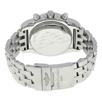 Stainless steel case with a stainless steel bracelet. Uni-directional rotating stainless steel bezel. Black dial with luminous silver-tone hands and index hour markers. 1/100th markers. minute markers around the outer rim. Dial Type: Analog. Luminescent hands and markers. Date display between 4 and 5 o'clock position. Chronograph - three sub-dials displaying: 60 second, 30 minute and 1/10th of a second. Breitling Calibre 01 automatic movement. Scratch resistant sapphire crystal. Screw down crown. Solid case back. Case size: 44 mm. Case thickness: 16.95 mm. Round case shape. Band width: 22-20 mm. Deployment clasp. Water resistant at 500 meters / 1650 feet. Functions: chronograph, date, hour, minute, second. Luxury watch style. Watch label: Swiss Made. Item Variations: AB01104D BC62, AB01104D.BC62, AB01104DBC62, AB01104D-BC62-377A. Breitling Chronomat 44 Automatic Black Dial Men's Watch AB01104D-BC62.