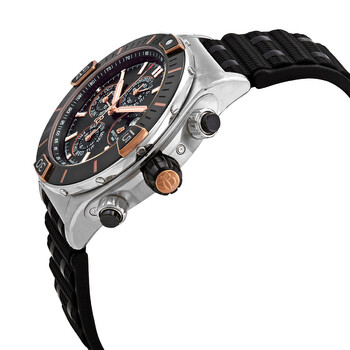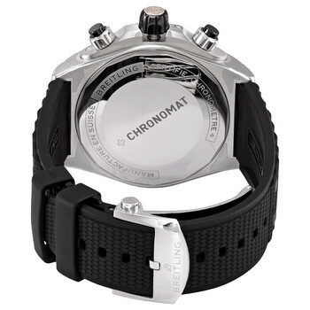 Stainless steel case with a black rubber strap. Uni-directional rotating stainless steel bezel with an inlaid black ring. Black dial with luminous rose gold-tone hands and index hour markers. Minute markers. Tachymeter markings around the outer rim. Dial Type: Analog. Luminescent hands and markers. Four sub-dials displaying: 60 seconds / date, 30 minute / month and 12 hour / day of the week and moonphase. Automatic movement. Scratch resistant sapphire crystal. Screw down crown. Solid case back. Round case shape. Case size: 44 mm. Case thickness: 14.5 mm. Band width: 22 mm / 20 mm. Fold over clasp with a push button release. Water resistant at 100 meters / 330 feet. Functions: date, day, month, hour, minute, second, tachymeter. Additional Info: four year calendar. Chronomat 44 Series. Luxury watch style. Watch label: Swiss Made. Breitling Chronomat 44 Automatic Black Dial Men's Watch I19320251B1A1.