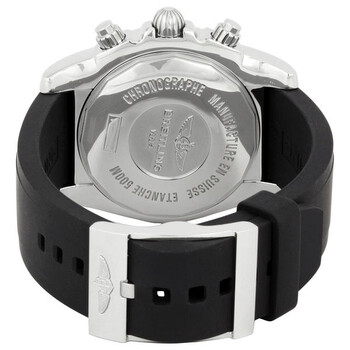 Stainless steel case with a black rubber strap. Uni-directional rotating bezel. Blue dial with silver-tone hands and stick hour markers. Minute markers around the outer rim. Dial Type: Analog. Luminescent hands and markers. Date display appears between the 4 and 5 o'clock positions. Chronograph - three sub-dials displaying: 60 second, 30 minute and 12 hour. Self winding mechanical movement. Scratch resistant sapphire crystal. Screw down crown. Solid case back. Case diameter: 44 mm. Case thickness: 16.95 mm. Round case shape. Band width: 22 mm. Tang clasp. Water resistant at 500 meters / 1650 feet. Functions: chronograph, date, hour, minute, second. Sport watch style. Watch label: Swiss Made. Breitling Chronomat 44 Automatic Chronograph Blue Dial Men's Watch AB011011-C789.