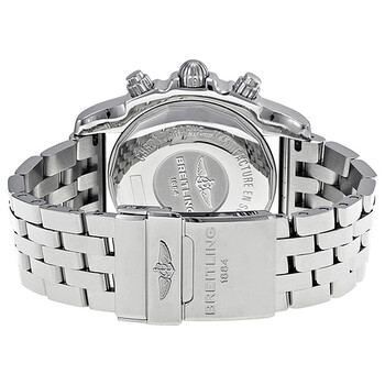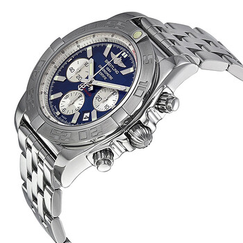 Stainless steel case with a stainless steel bracelet. Uni-directional rotating stainless steel bezel. Metallica blue dial with silver-tone hands and stick hour markers. Minute markers. tachymeter around the outer rim. Dial Type: Analog. Luminescent hands and markers. Date display between 4 and 5 o'clock positions. Chronograph - three sub-dials displaying: 60 second, 30 minute and 12 hour. Automatic movement with a 70 hour power reserve. Scratch resistant sapphire crystal. Screw locked crown. Solid case back. Case diameter: 44 mm. Case thickness: 16.95 mm. Round case shape. Band width: 22 mm. Fold over with safety release clasp. Water resistant at 500 meters / 1650 feet. Functions: chronograph, date, hour, minute, second. Luxury watch style. Watch label: Swiss Made. Breitling Chronomat 44 Automatic Chronograph Blue Dial Stainless Steel Men's Watch AB011011-C788SS.