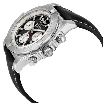 Stainless steel case with a black leather strap. Uni-directional rotating stainless steel bezel. Black dial with luminous silver-tone hands and index hour markers. Minute markers. 1/100th markers. Tachymeter markings around the outer rim. Dial Type: Analog. Luminescent hands and markers. Date display between 4 and 5 o'clock positions. Chronograph - three sub-dials displaying: 60 second, 30 minute and 12 hour. Automatic movement with a 70 hour power reserve. Scratch resistant sapphire crystal. Screw locked crown - two gaskets. Solid case back. Case diameter: 43.5 mm. Case thickness: 16.95 mm. Round case shape. Band width: 22 mm / 20 mm. Tang clasp. Water resistant at 500 meters / 1650 feet. Functions: chronograph, tachymeter, date, hour, minute, second. Luxury watch style. Watch label: Swiss Made. Breitling Chronomat 44 Black Dial Black Leather Men's Watch AB011011-B967BKLT.