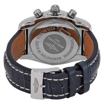 Silver-tone stainless steel case with a blue crocodile leather strap. Uni-directional rotating silver-tone stainless steel bezel. Blue dial with silver-tone hands and Roman numeral hour markers. Minute markers around the outer rim. Dial Type: Analog. Luminescent hands and markers. Date display between 4 and 5 o'clock position. Breitling Calibre 01 Automatic movement, containing 47 Jewels, composed of 346 parts, bitting at 28800 vph, and has a power reserve of approximately 70 hours. Scratch resistant sapphire crystal. Screw down crown. Solid case back. Round case shape, case size: 44 mm, case thickness: 16.95 mm. Tang clasp. Water resistant at 500 meters / 1650 feet. Functions: chronograph, date, hour, minute, second. Chronomat 44 Series. Dive watch style. Watch label: Swiss Made. Breitling Chronomat 44 Chronograph Automatic Blue Dial Men's Watch AB011011/C783.731P.A20BA.1.