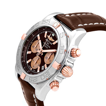 Polished 18k rose gold and stainless steel case with a brown alligator leather strap. Uni-directional rotating silver-tone stainless steel bezel. Brown dial with rose gold hands and index hour markers. Minute markers around the outer rim. Dial Type: Analog. Luminescent hands and markers. Date display between 4 and 5 o'clock position. Chronograph - three sub-dials displaying: 60 second, 30 minute and 12 hours. Automatic movement. Scratch resistant sapphire crystal. Screw down crown. Solid case back. Round case shape, case size: 43.5 mm. Band width: 22 mm. Tang clasp. Water resistant at 500 meters / 1650 feet. Functions: chronograph, date, hour, minute, second. Chronomat 44 Series. Dive watch style. Watch label: Swiss Made. Breitling Chronomat 44 Chronograph Automatic Brown Dial Men's Watch IB011012/Q576.740P.A20D.1.