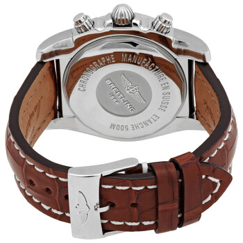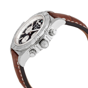 Silver-tone stainless steel case with a brown crocodile leather strap. Uni-directional rotating silver-tone stainless steel bezel. Black dial with silver-tone hands and index hour markers. Tachymeter scale around the outer rim. Dial Type: Analog. Luminescent hands and markers. Date display between 4 and 5 o'clock position. Chronograph - three sub-dials displaying: 60 second, 30 minute and 12 hour. Breitling Calibre 01 Automatic movement, containing 47 Jewels, composed of 346 parts, bitting at 28800 vph, and has a power reserve of approximately 70 hours. Scratch resistant sapphire crystal. Screw down crown. Solid case back. Round case shape, case size: 44 mm. Tang clasp. Water resistant at 500 meters / 1650 feet. Functions: chronograph, chronometer, date, hour, minute, second. Chronomat 44 Series. Luxury watch style. Breitling Chronomat 44 Chronograph Automatic Chronometer Black Dial Men's Watch AB011012/B967.743P.A20BA.1.