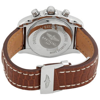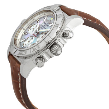 Silver-tone stainless steel case with a brown crocodile leather strap. Uni-directional rotating bezel. Gray mother of pearl dial with silver-tone hands and index hour markers. Tachymeter. Dial Type: Analog. Luminescent hands and markers. Date display between 4 and 5 o'clock position. Chronograph - three sub-dials displaying: 60 second, 30 minute and 12 hour. Breitling Calibre 01 Automatic movement, containing 47 Jewels, composed of 346 parts, bitting at 28800 vph, and has a power reserve of approximately 70 hours. Scratch resistant sapphire crystal. Screw down crown. Solid case back. Round case shape, case size: 43.70 mm, case thickness: 17.1 mm. Band width: 22 mm. Deployment clasp. Water resistant at 500 meters / 1650 feet. Functions: chronograph, date, hour, minute, second, chronometer. Chronomat 44 Series. Luxury watch style. Watch label: Swiss Made. Item Variations: AB011012 G685BRCD, AB011012.G685BRCD, AB011012G685BRCD. Breitling Chronomat 44 Chronograph Automatic Chronometer Men's Watch AB011012-G685BRCD.
