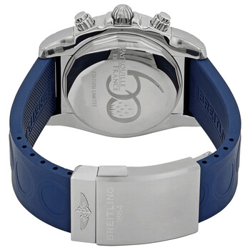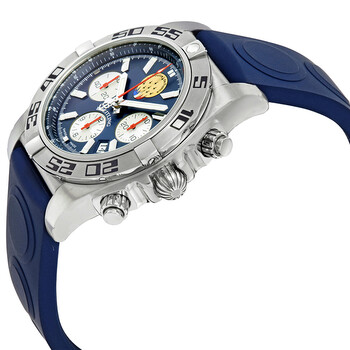 Stainless steel case with a blue rubber strap. Fixed stainless steel bezel. Metallica blue dial with silver-tone hands and index hour markers. Minute markers. 1/100th second markers. Tachymeter markings around the outer rim. Dial Type: Analog. Luminescent hands and markers. Date display between the 4 and 5 o'clock positions. Chronograph - three white sub-dials displaying: 60 second, 30 minute and 12 hour. Breitling calibre 01 automatic movement with a 70-hour power reserve. Scratch resistant sapphire crystal. Screw locked crown. Solid case back. Round case shape. Case size: 44 mm. Case thickness: 17 mm. Band width: 20 mm. Deployment clasp with a push button release. Water resistant at 500 meters / 1650 feet. Functions: chronograph, tachymeter, date, hour, minute, second, chronometer. Dive watch style. Watch label: Swiss Made. Item Variations: AB01109E C886, AB01109E.C886, AB01109EC886. Breitling Chronomat 44 Chronograph Automatic Chronometer Men's Watch AB01109E-C886.