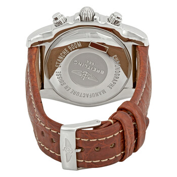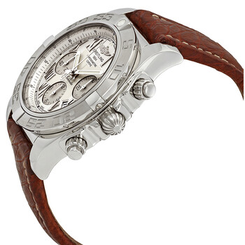 Stainless steel case with a brown (crocodile) leather strap. Uni-directional rotating stainless steel bezel. Silver dial with luminous silver-tone hands and Roman numeral hour markers. Minute markers. 1/100th seconds markers. Tachymeter markings around the outer rim. Dial Type: Analog. Luminescent hands and markers. Date display between the 4 and 5 o'clock positions. Chronograph - three sub-dials displaying: 60 second, 30 minute and 12 hour. Breitling calibre 01 automatic movement with a 70-hour power reserve. Scratch resistant sapphire crystal. Screw locked crown. Solid case back. Round case shape. Case size: 44 mm. Case thickness: 17.10 mm. Band width: 20 mm / 22 mm. Tang clasp. Water resistant at 500 meters / 1650 feet. Functions: chronograph, tachymeter, date, hour, minute, second, chronometer. Luxury watch style. Watch label: Swiss Made. Item Variations: AB011011 G676BRCT, AB011011.G676BRCT, AB011011G676BRCT. Breitling Chronomat 44 Chronograph Automatic Chronometer Silver Dial Men's Watch AB011011/G684BRCT.