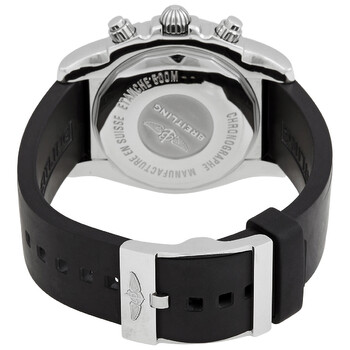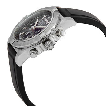 Silver-tone stainless steel case with a black rubber strap. Uni-directional rotating brushed bezel. Grey dial with silver-tone hands and index hour markers. Tachymeter. Dial Type: Analog. Luminescent hands and markers. Date display between 4 and 5 o'clock position. Chronograph - three sub-dials displaying: 60 second, 30 minute and 12 hours. Automatic movement. Scratch resistant sapphire crystal. Screw down crown. Solid case back. Round case shape, case size: 44 mm. Tang clasp. Water resistant at 500 meters / 1650 feet. Functions: chronograph, date, hour, minute, second. Chronomat 44 Series. Luxury watch style. Watch label: Swiss Made. Breitling Chronomat 44 Chronograph Automatic Grey Dial Men's Watch AB011011/F546.131S.A20S.1.