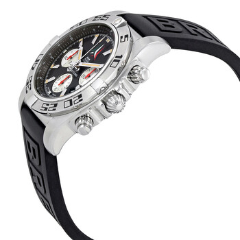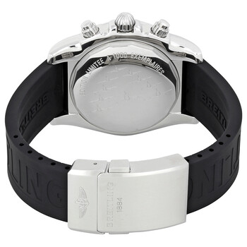 Stainless steel case with a black (diver pro III) rubber strap. Uni-directional rotating stainless steel bezel. Black dial with luminous silver-tone hands and index hour markers. Minute markers. Tachymeter markings around the outer rim. Dial Type: Analog. Date display between the 4 and 5 o'clock positions. Chronograph - three sub-dials displaying: 60 second, 30 minute and 12 hours. Breitling calibre 01 automatic movement with a 70-hour power reserve. Scratch resistant sapphire crystal. Screw locked crown. Solid case back. Case size: 44 mm. Case thickness: 17 mm. Round case shape. Band width: 22 mm. Deployment clasp. Water resistant at 500 meters / 1650 feet. Functions: chronograph, tachymeter, date, hour, minute, second. Additional Info: limited edition of 1000 pieces. Luxury watch style. Watch label: Swiss Made. Breitling Chronomat 44 Chronograph Automatic Men's Watch AB01104D/BC62-153S.