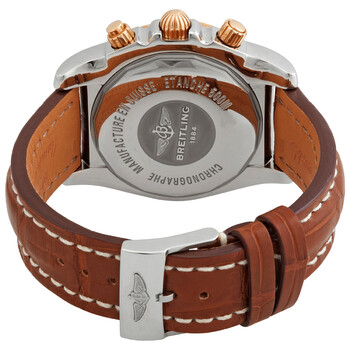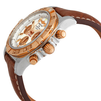 Silver-tone stainless steel case with a brown crocodile leather strap. Uni-directional rotating 18kt rose gold bezel. Antarctic white dial with rose gold hands and index hour markers. Tachymeter. Dial Type: Analog. Luminescent hands and markers. Date display between 4 and 5 o'clock position. Chronograph - three sub-dials displaying: 60 second, 30 minute and 12 hours. Automatic movement. Scratch resistant sapphire crystal. Screw down crown. Solid case back. Round case shape, case size: 43.5 mm. Tang clasp. Water resistant at 500 meters / 1650 feet. Functions: chronograph, date, hour, minute, second. Chronomat 44 Series. Luxury watch style. Watch label: Swiss Made. Breitling Chronomat 44 Chronograph Automatic Men's Watch CB011012/A696.748P.A20BA.1.