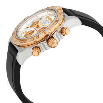 Silver-tone stainless steel case with a black rubber strap. Uni-directional rotating 18kt rose gold bezel. Mother of pearl dial with rose gold-tone hands and index hour markers. Tachymeter. Dial Type: Analog. Luminescent hands and markers. Date display between 4 and 5 o'clock position. Chronograph - three sub-dials displaying: 60 second, 30 minute and 12 hours. Breitling Calibre 01 Automatic movement, containing 47 Jewels, composed of 346 parts, bitting at 28800 vph, and has a power reserve of approximately 70 hours. Scratch resistant sapphire crystal. Screw down crown. Solid case back. Round case shape, case size: 44 mm. Tang clasp. Water resistant at 500 meters / 1650 feet. Functions: chronograph, date, hour, minute, second. Chronomat 44 Series. Dive watch style. Watch label: Swiss Made. Breitling Chronomat 44 Chronograph Automatic Men's Watch CB011012/A697.131S.A20S.1.