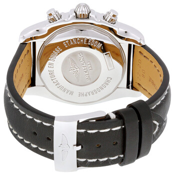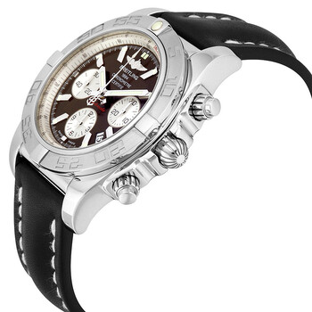 Stainless steel case with a black leather strap. Uni-directional rotating stainless steel bezel. Brown dial with luminous silver-tone hands and Roman numeral hour markers. Minute markers. 1/100th markers. Tachymeter markings around the outer rim. Dial Type: Analog. Luminescent hands and markers. Date display between 4 and 5 o'clock positions. Chronograph - three white sub-dials displaying: 60 second, 30 minute and 12 hour. Automatic movement. Scratch resistant sapphire crystal. Screw locked crown - two gaskets. Solid case back. Case diameter: 43.5 mm. Case thickness: 16.95 mm. Round case shape. Band width: 22 mm / 20 mm. Band length: 8.5 inches. Tang clasp. Water resistant at 500 meters / 1650 feet. Functions: chronograph, tachymeter, date, hour, minute, second. Luxury watch style. Watch label: Swiss Made. Breitling Chronomat 44 Dial Black Leather Men's Watch AB011011-Q575BKLT.