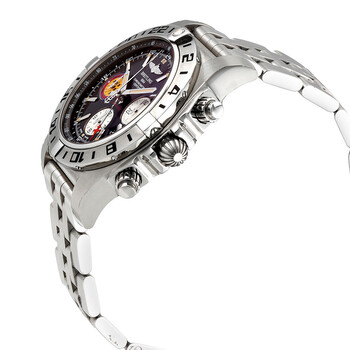 Stainless steel case with a stainless steel bracelet. Bi-directional rotating stainless steel bezel. Black dial with silver-tone hands and index hour markers. Minute markers. 24 hour markers. tachymeter markings around the outer rim. Dial Type: Analog. Luminescent hands and markers. Date display between the 4 and 5 o'clock positions. Chronograph - three sub-dials displaying: 60 second, 30 minute and 12 hour. Breitling Calibre 04 automatic movement with about 70 hours of power reserve. Scratch resistant sapphire crystal. Screw down crown. Solid case back. Case size: 44 mm. Case thickness: 16.95 mm. Round case shape. Band width: 22 mm / 20 mm. Deployment clasp. Water resistant at 200 meters / 660 feet. Functions: GMT, date, second time zone, hour, minute, second. Additional Info: limited edition of 1000 pcs. Luxury watch style. Watch label: Swiss Made. Breitling Chronomat 44 GMT Black Dial Men's Watch AB04203J/BD29SS.