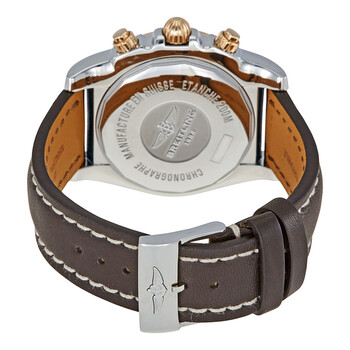 Stainless steel case with a black leather strap. Bi-directional rotating 18kt rose gold bezel. Black dial with luminous rose gold-tone hands and index hour markers. Minute markers. 24 hour markers. Tachymeter markings around the outer rim. Dial Type: Analog. Luminescent hands and markers. Date display between 4 and 5 o'clock position. Chronograph - three gold sub-dials displaying: 60 second, 30 minute and 12 hour. Breitling calibre 04 automatic movement with a 70-hour power reserve. Scratch resistant sapphire crystal. Screw locked crown. Solid case back. Case size: 44 mm. Case thickness: 16.90 mm. Round case shape. Band width: 22 mm / 20 mm. Tang clasp. Water resistant at 200 meters / 660 feet. Functions: date, GMT, second time zone, hour, minute, second, tachymeter,. Luxury watch style. Watch label: Swiss Made. Breitling Chronomat 44 GMT Black Dial Men's Watch CB042012/BB86BKLT.