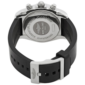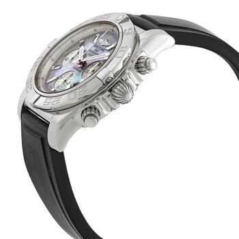 Stainless steel case with a black diver pro III (rubber) strap. Uni-directional rotating bezel. Mother of pearl dial with silver-tone hands and index hour markers. Tachymeter scale around the outer rim. Dial Type: Analog. Luminescent hands and markers. Date display between 4 and 5 o'clock position. Chronograph - three sub-dials displaying: 60 second, 30 minute and 12 hour. Automatic movement. Caliber 01 engine. Scratch resistant sapphire crystal. Screw down crown. Solid case back. Case diameter: 44 mm. Round case shape. Tang clasp. Water resistant at 500 meters / 1650 feet. Functions: chronograph, date, hour, minute, second. Luxury watch style. Breitling Chronomat 44 Mother Of Pearl Dial Black Rubber Men's Watch AB011012/G685BKPT3.