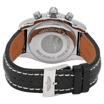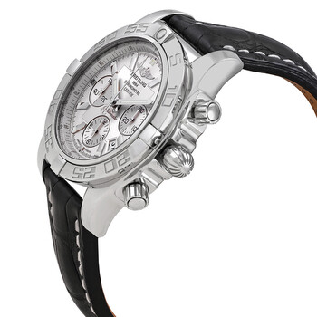 Stainless steel case with a black crocodile leather strap. Uni-directional rotating bezel. Sierra silver dial with silver-tone hands and index hour markers. Tachymeter scale around the outer rim. Dial Type: Analog. Luminescent hands and markers. Date display between 4 and 5 o'clock position. Chronograph - three sub-dials displaying: 60 second, 30 minute and 12 hour. Automatic movement. Caliber 01 engine. Scratch resistant sapphire crystal. Screw down crown. Solid case back. Case diameter: 44 mm. Round case shape. Buckle clasp. Water resistant at 500 meters / 1650 feet. Functions: chronograph, date, hour, minute, second. Luxury watch style. Breitling Chronomat 44 Sierra Silver Dial Stainless Steel Men's Watch AB011012/G684BKCD.