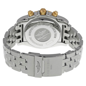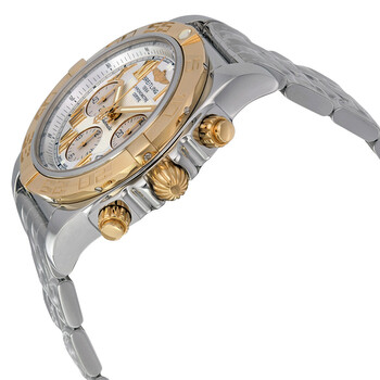 Stainless steel a case with a stainless steel bracelet. Uni-directional rotating 18kt gold bezel. Silver dial with luminous rose gold hands and Roman numeral hour markers. Minute markers. 24 hour markers. Tachymeter around the outer rim. Dial Type: Analog. Luminescent hands and markers. Date display between 4 and 5 o'clock positions. Chronograph - three sub-dials displaying: 60 second, 30 minute and 12 hour. Automatic movement with 70 hour power reserve. Scratch resistant sapphire crystal. Screw locked crown. Solid case back. Case diameter: 44 mm. Case thickness: 17 mm. Round case shape. Deployment clasp. Water resistant at 500 meters / 1650 feet. Functions: chronograph, date, hour, minute, second. Luxury watch style. Watch label: Swiss Made. Breitling Chronomat 44 Silver Dial Stainless Steel Men's Watch CB011012-G677SS
