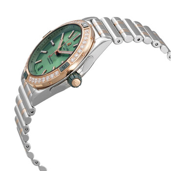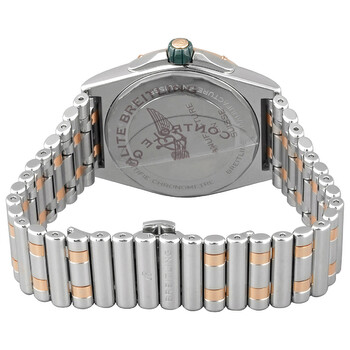Silver-tone stainless steel case with a two-tone (silver-tone and rose gold-tone) stainless steel and 18kt rose gold bracelet. Fixed rose gold-tone bezel with diamond set 18kt rose gold. Green dial with rose gold-tone hands and index hour markers. Minute markers around the outer rim. Dial Type: Analog. Luminescent hands and markers. Date display at the 6 o'clock position. Breitling Calibre 17 Automatic movement, based upon ETA 2824-2, containing 25 Jewels, bitting at 28800 vph, and has a power reserve of approximately 42 hours. Scratch resistant sapphire crystal. Solid case back. Round case shape, case size: 38 mm. Fold over clasp with a safety release. Water resistant at 100 meters / 330 feet. Functions: date, hour, minute, second, chronometer. Additional Info: original box, international warranty card, manual (complete accessories). Chronomat Series. Luxury watch style. Watch label: Swiss Made. Breitling Chronomat Automatic Chronometer Diamond Green Dial Unisex Watch U17356531L1U1.