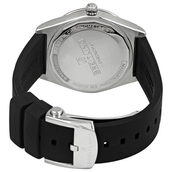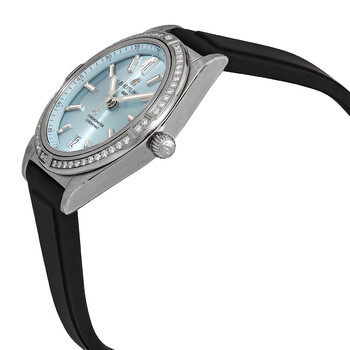 Stainless steel case with a black rubber strap. Uni-directional rotating 18kt grey gold bezel set with diamonds. Ice blue dial with silver-tone hands and diamond-tipped index hour markers. Arabic numeral minute markers (at 5 minute intervals). Minute markers around the outer rim. Dial Type: Analog. Luminescent hands and markers. Date display at the 6 o'clock position. Breitling calibre 10 automatic movement, based upon ETA 2892-A2, containing 21 Jewels, bitting at 28800 vph, and has a power reserve of approximately 42 hours. Scratch resistant sapphire crystal. Screw down crown. Solid case back. Round case shape. Case size: 36 mm. VCase thickness: 10 mm. Band width: 18 mm. Fold over clasp with a safety release. Water resistant at 100 meters / 330 feet. Functions: date, hour, minute, second. Chronomat Series. Luxury watch style. Watch label: Swiss Made. Breitling Chronomat Automatic Diamond Ice Blue Dial Ladies Watch G10380591C1S1.