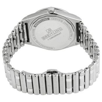 Stainless steel case with a stainless steel bracelet. Uni-directional rotating stainless steel bezel. Green dial with luminous silver-tone hands and index hour markers. Arabic numeral minute markers (at 5 minute intervals). Minute markers around the outer rim. Dial Type: Analog. Luminescent hands and markers. Date display at the 6 o'clock position. Breitling calibre 10 automatic movement, based upon ETA 2892-A2, containing 21 Jewels, bitting at 28800 vph, and has a power reserve of approximately 42 hours. Scratch resistant sapphire crystal. Pull / push crown. Solid case back. Round case shape. Case size: 36 mm. Case thickness: 10.1 mm. Band width: 18 mm. Fold over clasp with a push button release. Water resistant at 100 meters / 330 feet. Functions: date, hour, minute, second. Chronomat Series. Luxury watch style. Breitling Chronomat Automatic Green Dial Ladies Watch a10380101L1a1.