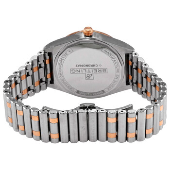 Stainless steel case with a stainless steel bracelet with 18kt rose gold links. Uni-directional rotating 18kt rose gold bezel. White dial with luminous rose gold hands and index hour markers. Arabic numeral minute markers (at 5 minute intervals). Minute markers around the outer rim. Dial Type: Analog. Luminescent hands and markers. Date display at the 6 o'clock position. Breitling calibre 10 automatic movement, based upon ETA 2892-A2, containing 21 Jewels, bitting at 28800 vph, and has a power reserve of approximately 42 hours. Scratch resistant sapphire crystal. Pull / push crown. Solid case back. Round case shape. Case size: 36 mm. Case thickness: 10.1 mm. Band width: 18 mm. Fold over clasp with a push button release. Water resistant at 100 meters / 330 feet. Functions: date, hour, minute, second. Chronomat Series. Luxury watch style. Watch label: Swiss Made. Breitling Chronomat Automatic White Dial Ladies Watch U10380101A1U1.